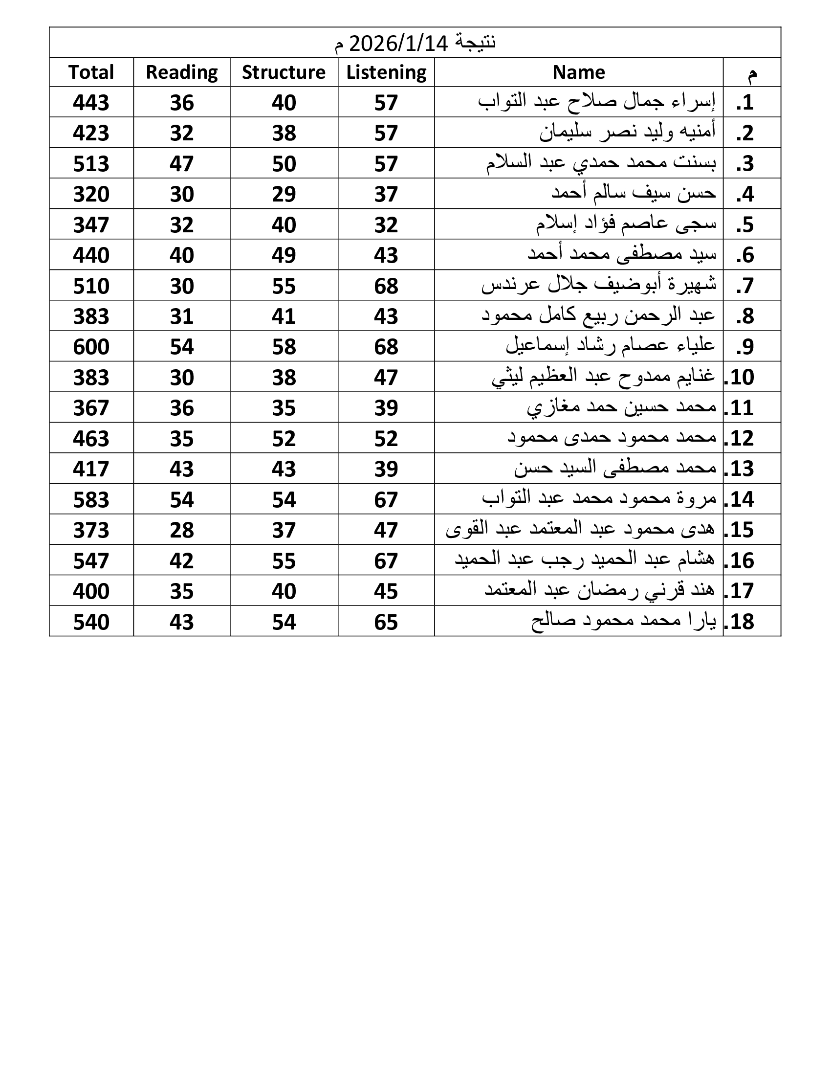 نتيجة اختبار أكاديمى 14/1/2026