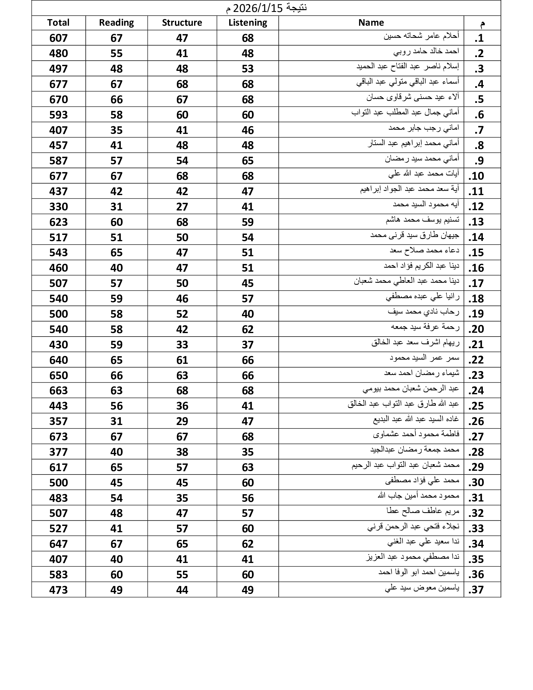نتيجة اختبار أكاديمى 15/1/2026