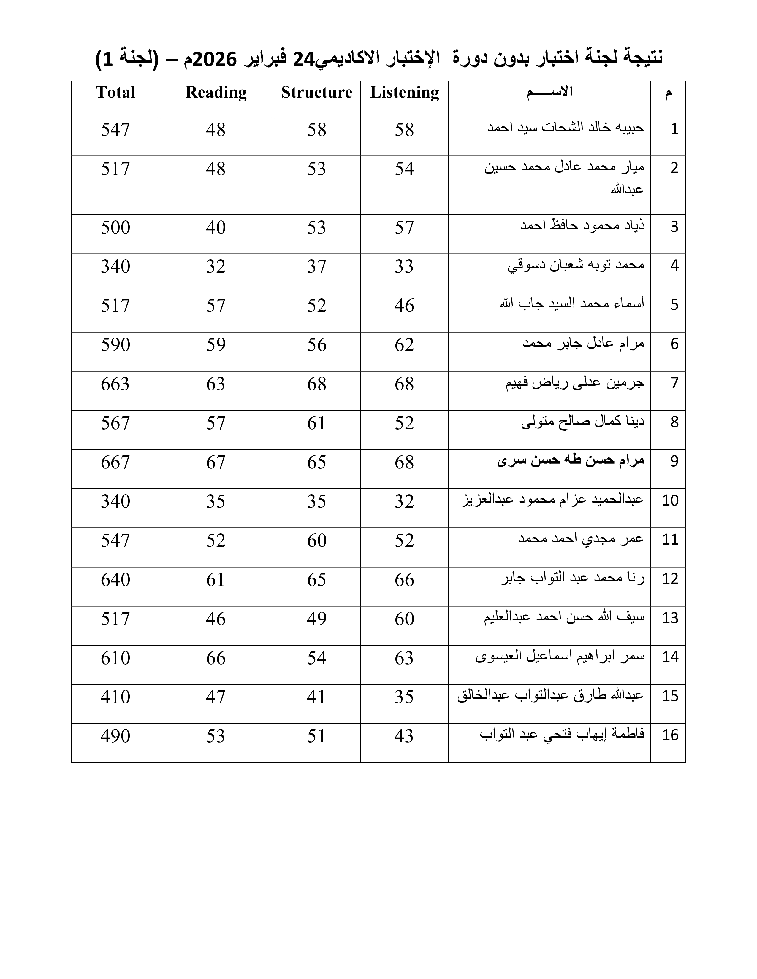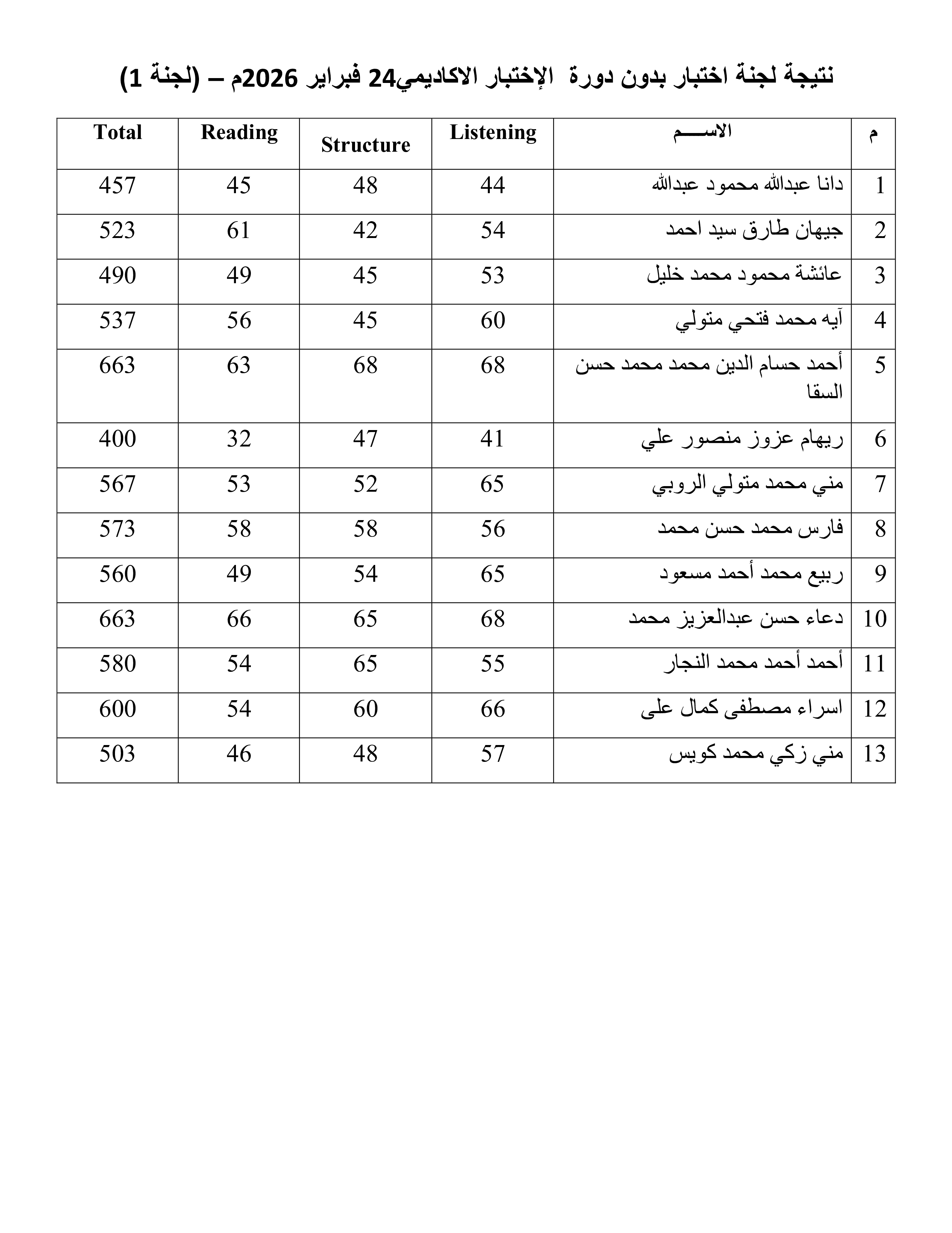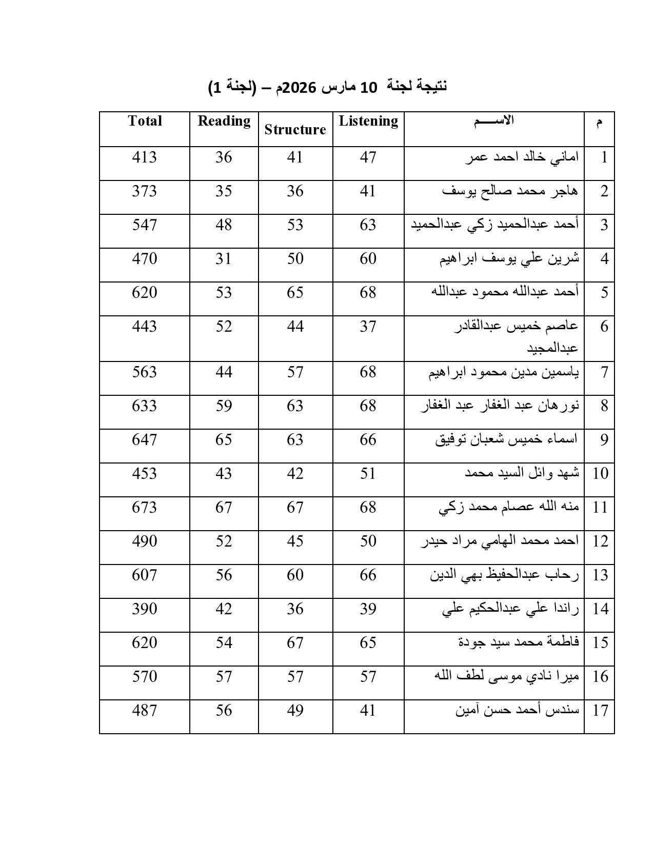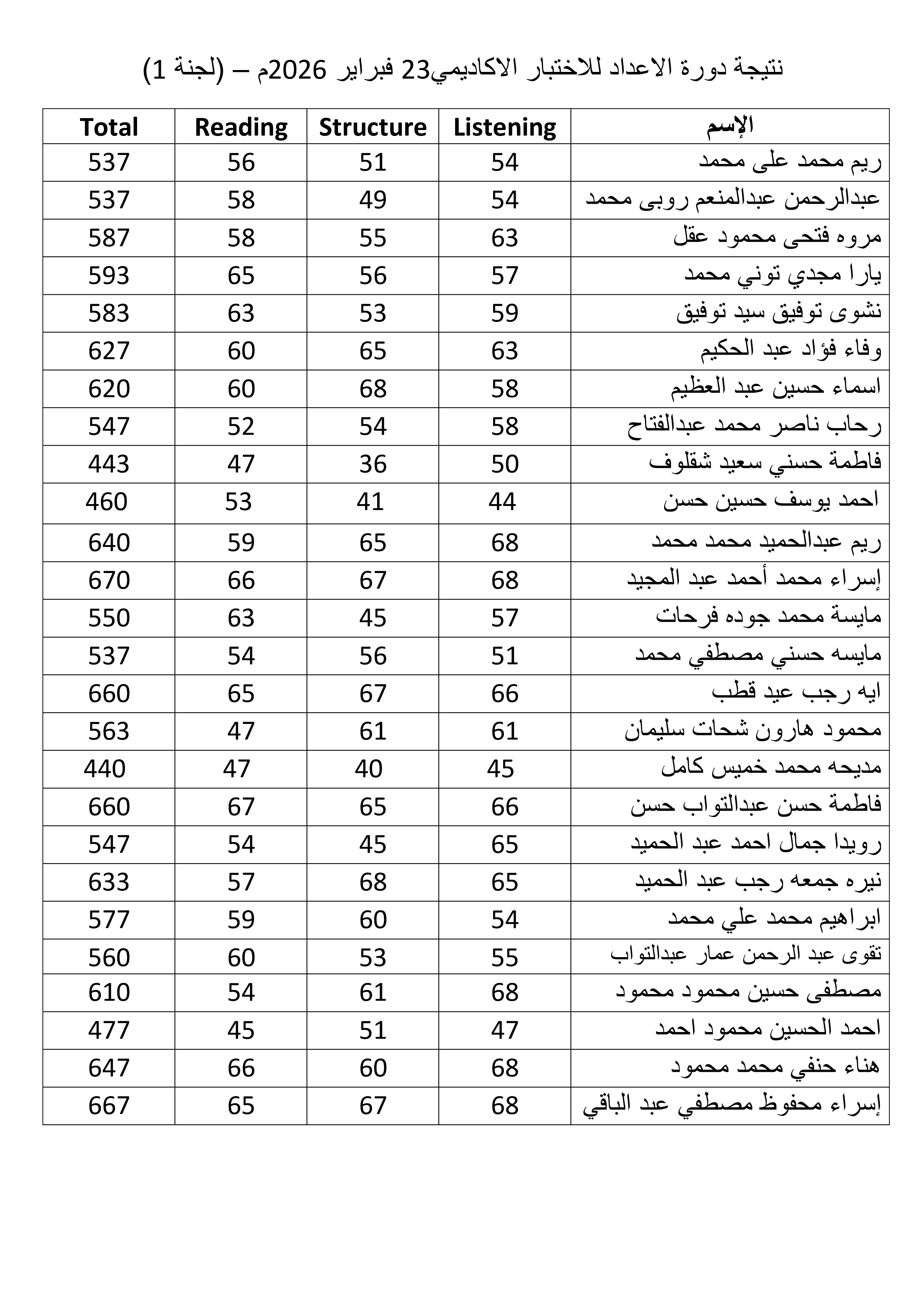 نتيجة الاختبار الأكاديمي لجنة 1 (10 مارس 2026)
