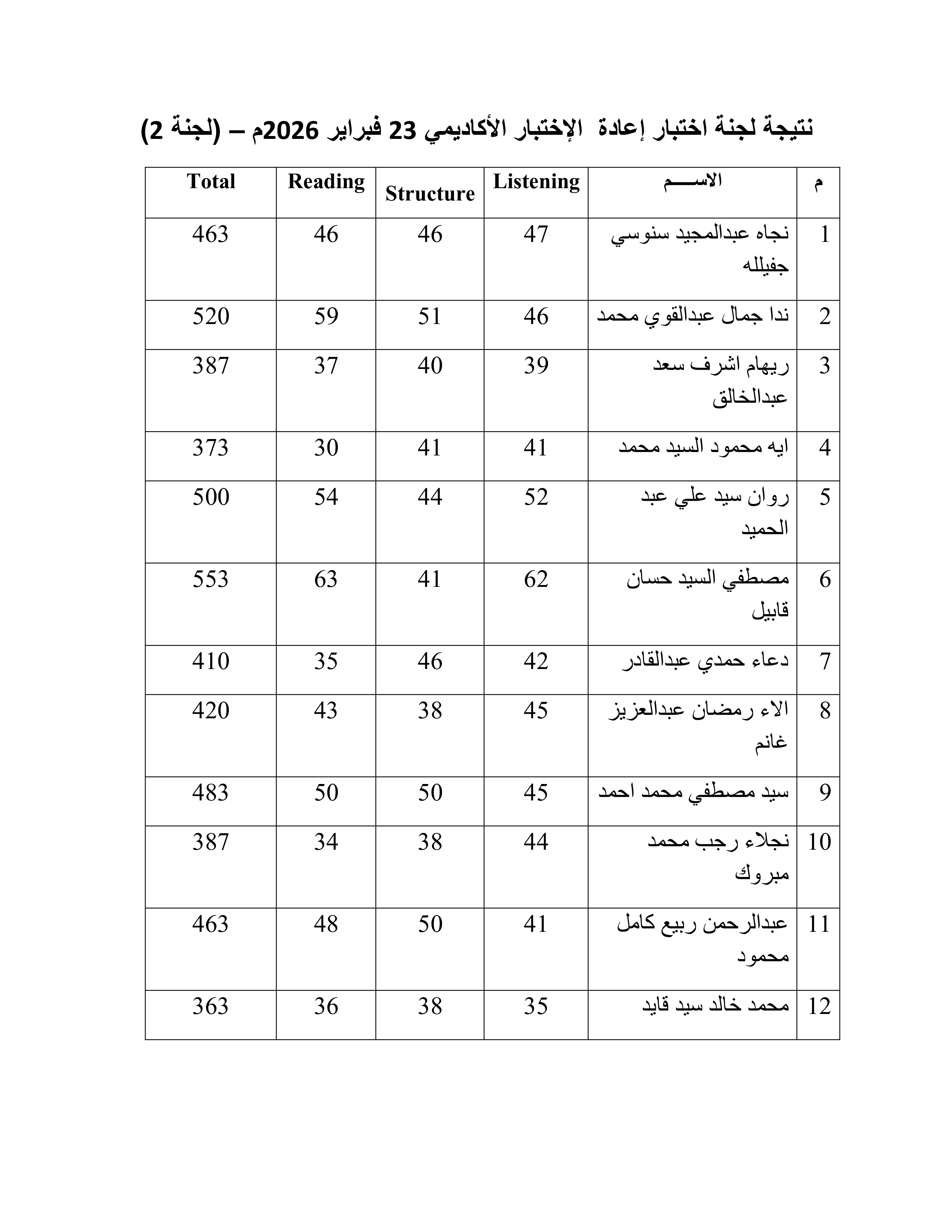 نتيجة لجنة (2) اختبار اكاديمي بدون دورة بتاريخ 24 فبراير 2026