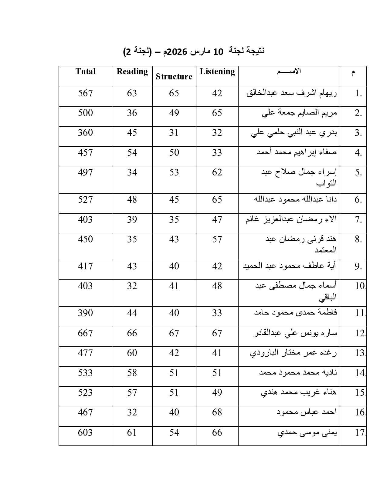 نتيجة الاختبار الاكاديمي لجنة (2) بتاريخ 10 مارس