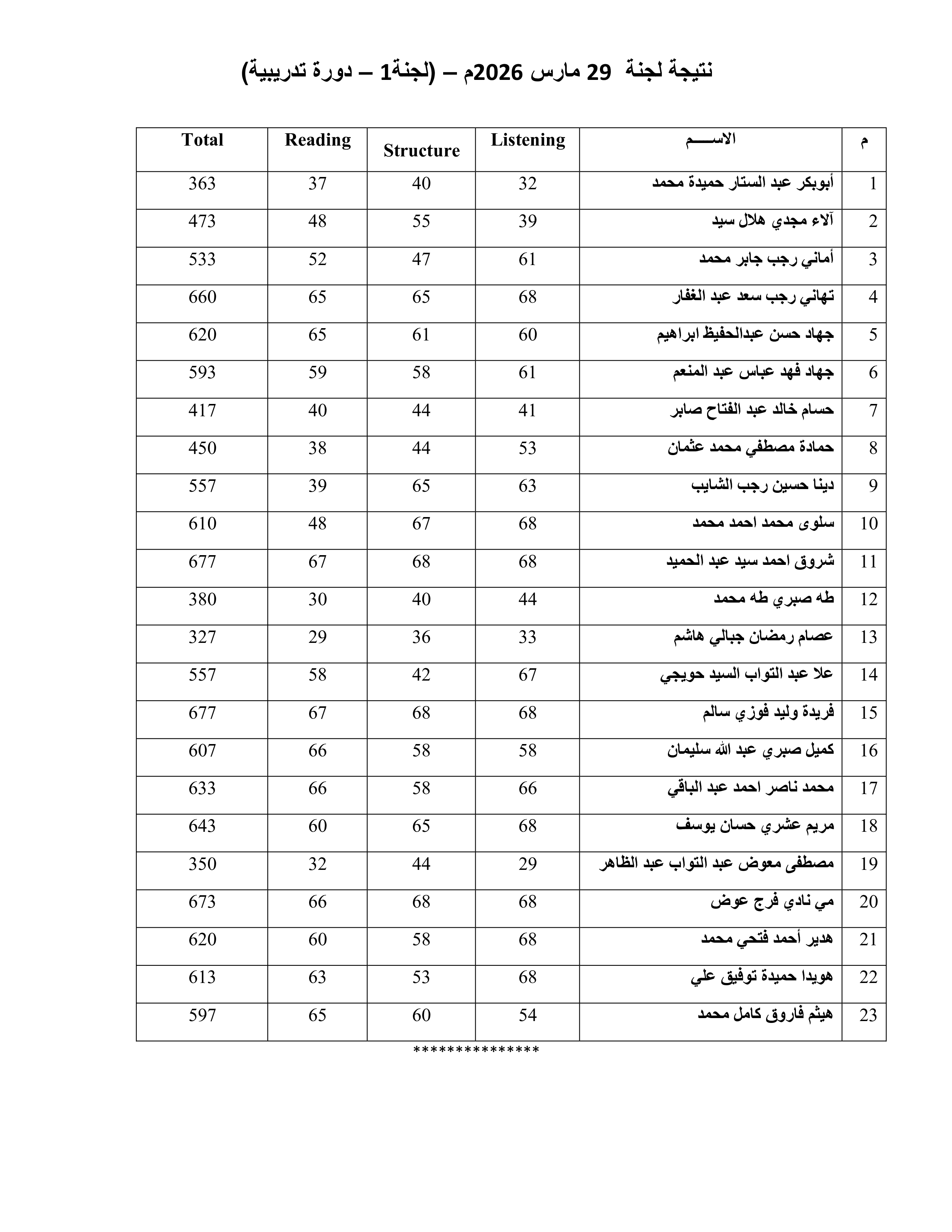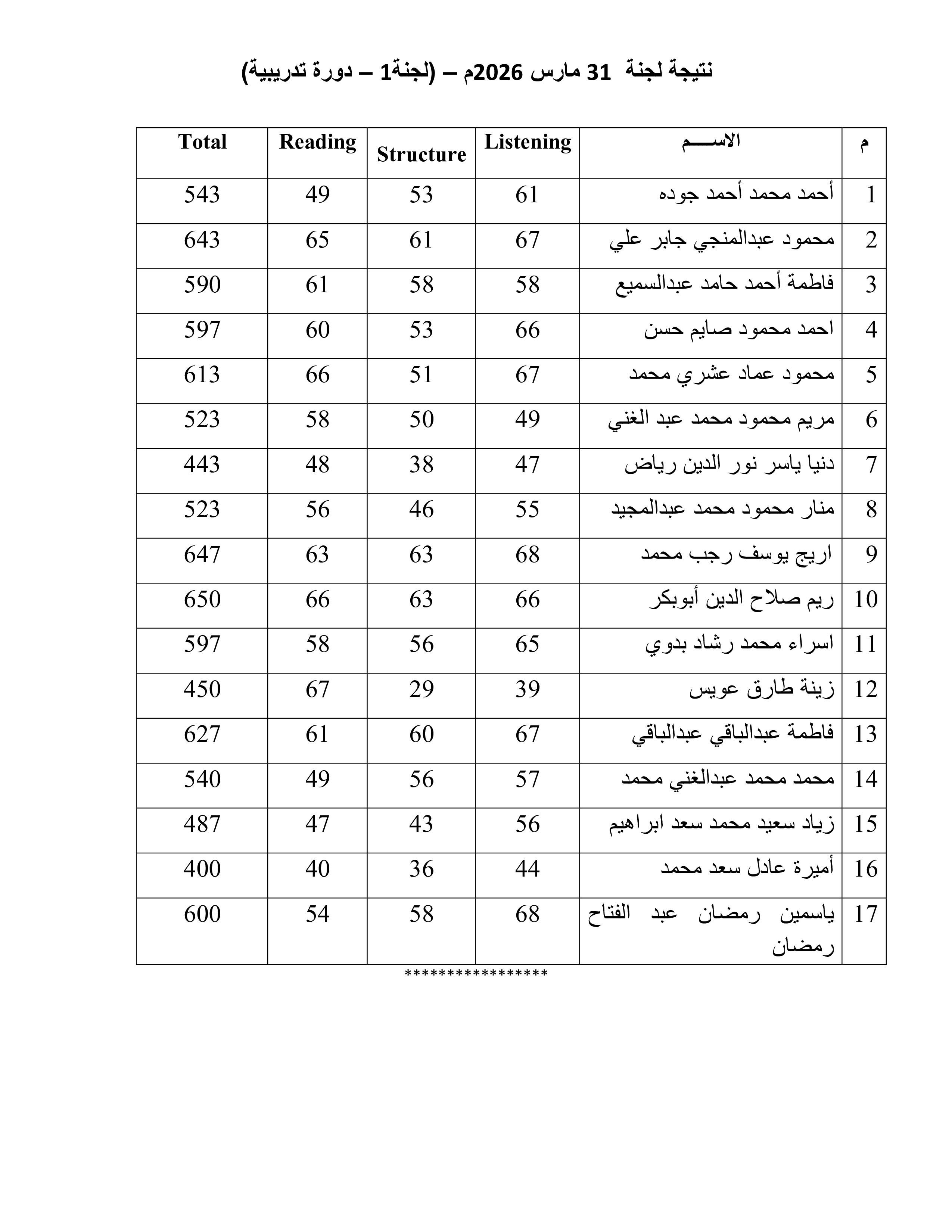 نتيجة لجنة 1 اختبار ا:اديمي بتاريخ 31 مارس 2026