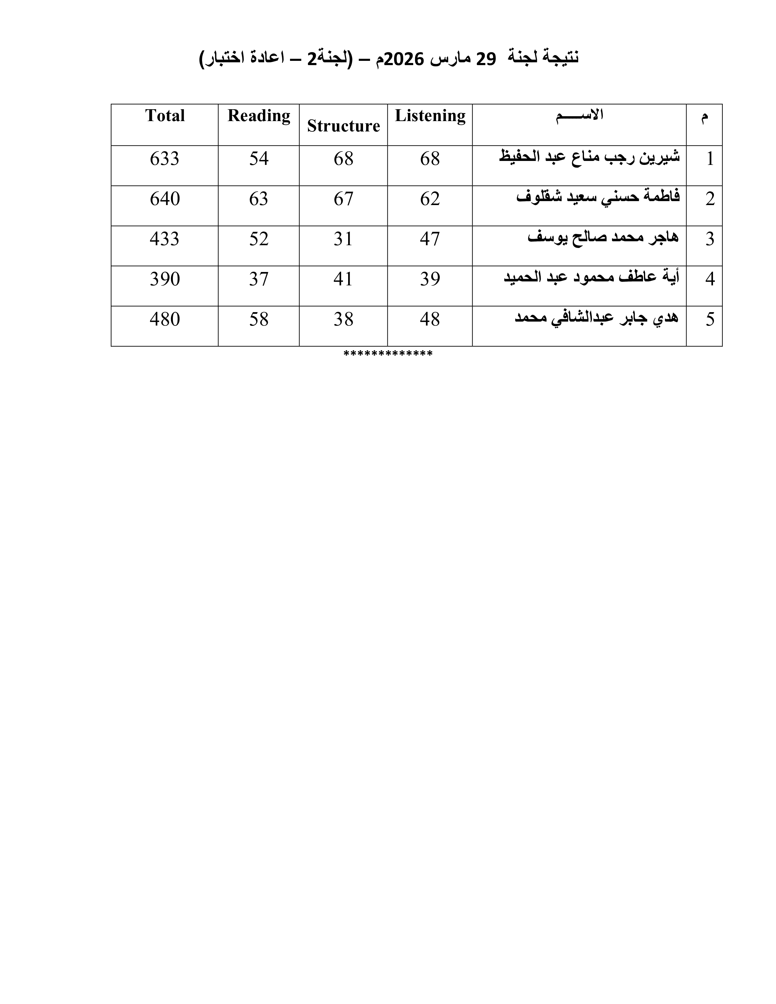 نتيجة إعادة الاختبار الأكاديمي لجنة (2) 29 مارس 2026
