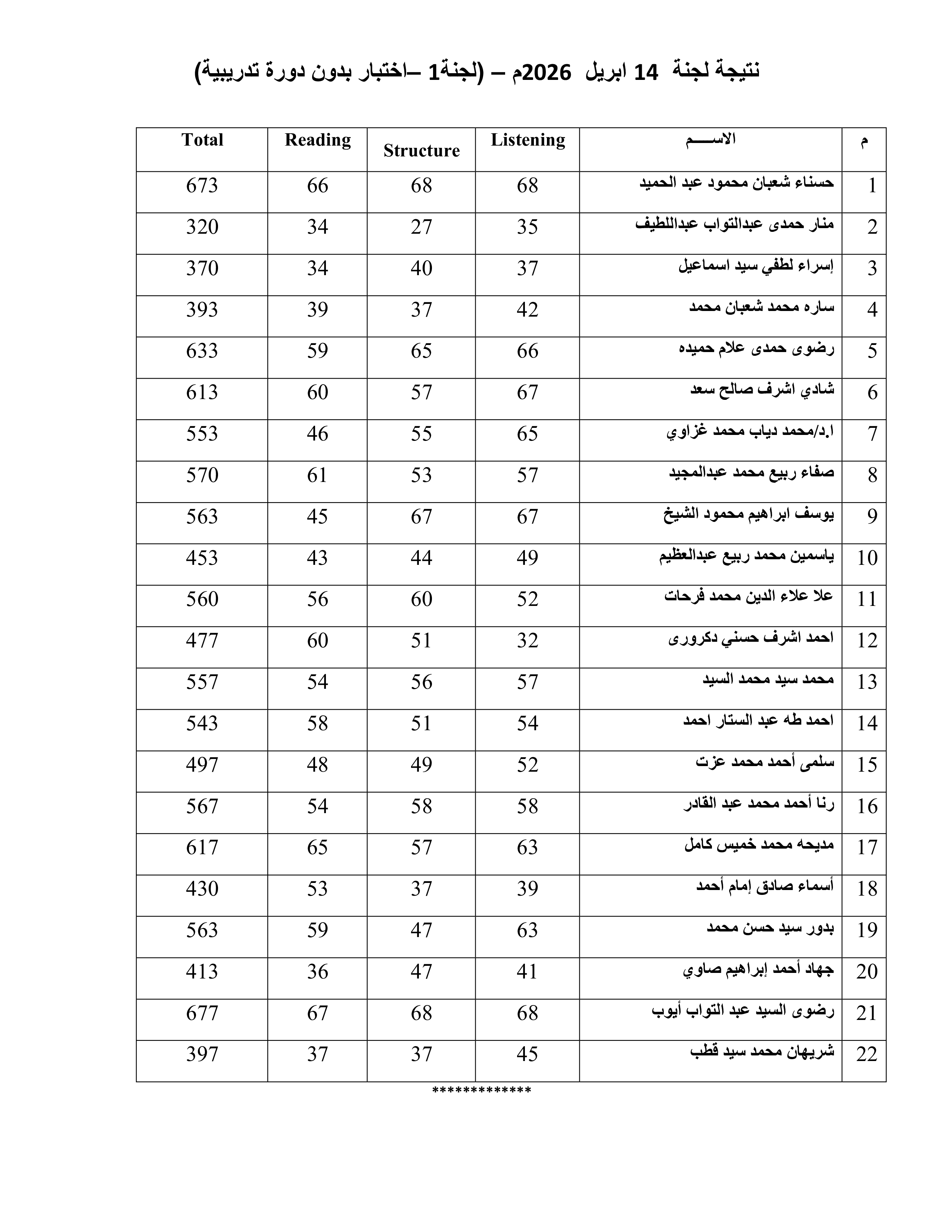 نتيجة لجنة (1) اختبار بدون دورة 14 ابريل 2026