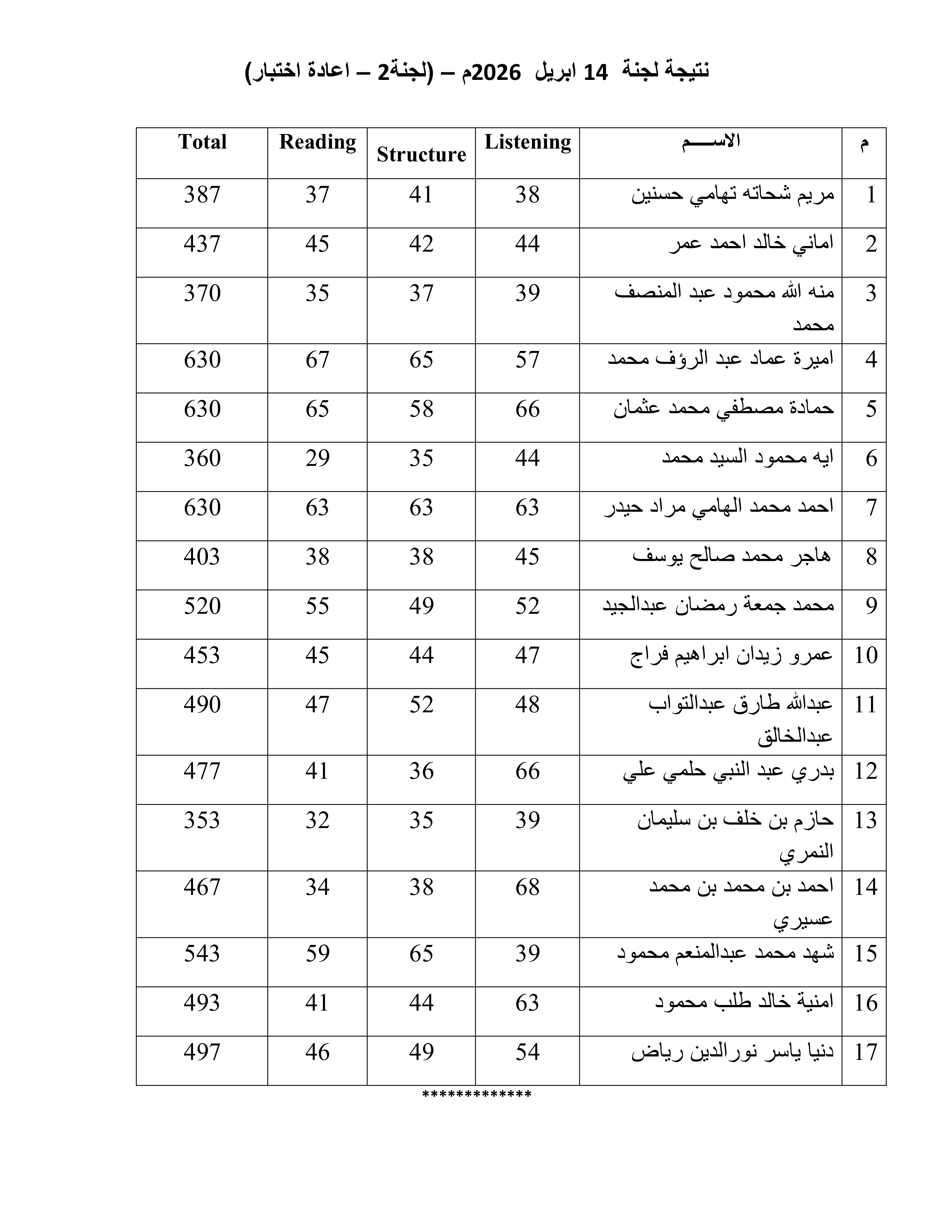 نتيجة لجنة (2) اعادة اختبار 14 ابريل 2026
